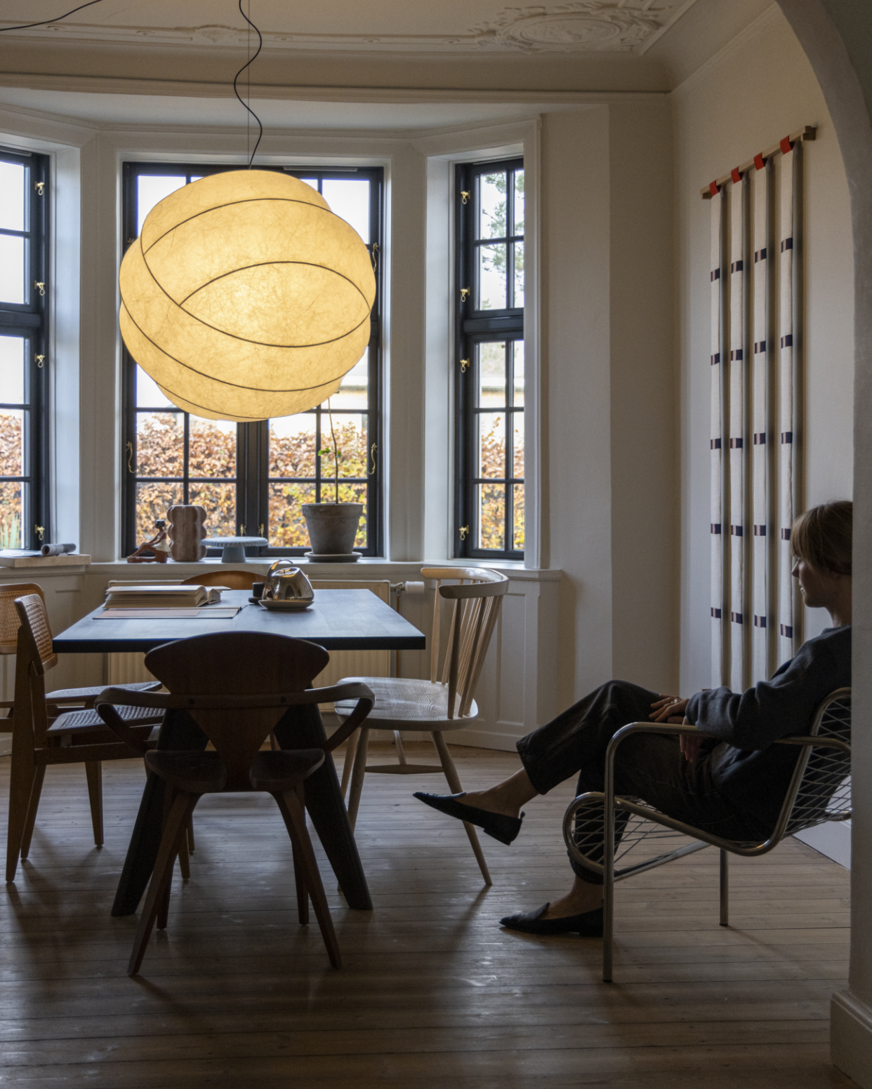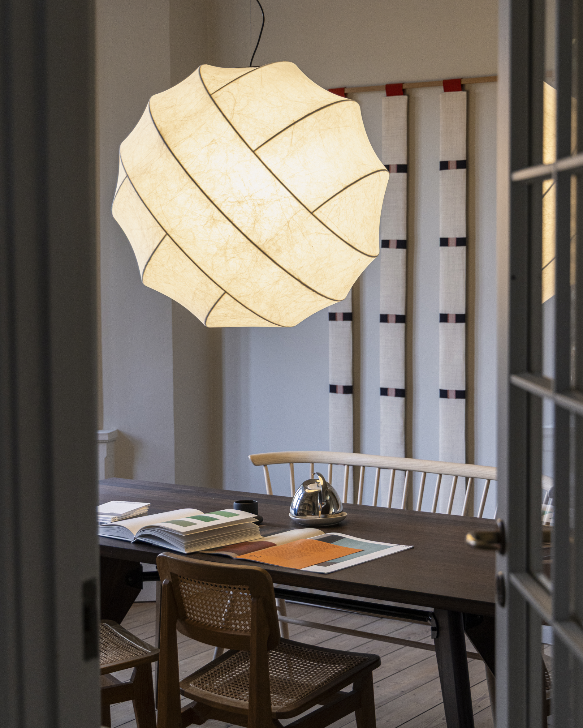 At the centre is the table, surrounded by art, books and objects collected over time. Chairs are pulled in, projects spread out, and nothing feels too fixed or curated. Architectural details give the room its structure, while lighting, materials and contrasting forms soften it. A room defined by use and personal layers, calm, generous and open to whatever happens within it.